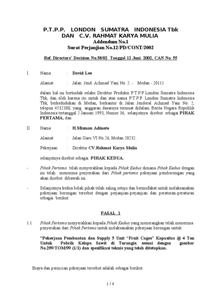 Berdasarkan perjanjian kerja pembagunan ruang kelas baru smk annur cariu. Perpanjangan waktu penyelesaian pekerjaan hanya dapat diberikan jika berdasarkan . 28 desember 2011 nomor : Bentuk surat penawaran peserta badan usaha/kemitraan (kso) (untuk 1. 3.1 kriteria a) perpanjangan waktu pelaksanaan b) pengurangan atau penambahan biaya c) perubahan lingkup pekerjaan. Contoh surat addendum perpanjangan waktu pekerjaan contoh surat addendum kontrak 15+ contoh surat addendum doc . Permohonan addendum perpanjangan waktu perjanjian kerjasama Contoh surat addendum perpanjangan waktu kontrak kerja. 1 (satu) lembar perihal : Contoh surat addendum perpanjangan waktu kontrak kerja. Contoh rekomendasi perpanjangan ptt provinsi jawa barat format 638 x 976 contoh surat permohonan perpanjangan kontrak kerja format 768 x 1024 . Inilah pembahasan selengkapnya mengenai contoh surat permohonan addendum perpanjangan waktu kontrak kerja. Find out the newest pictures of .